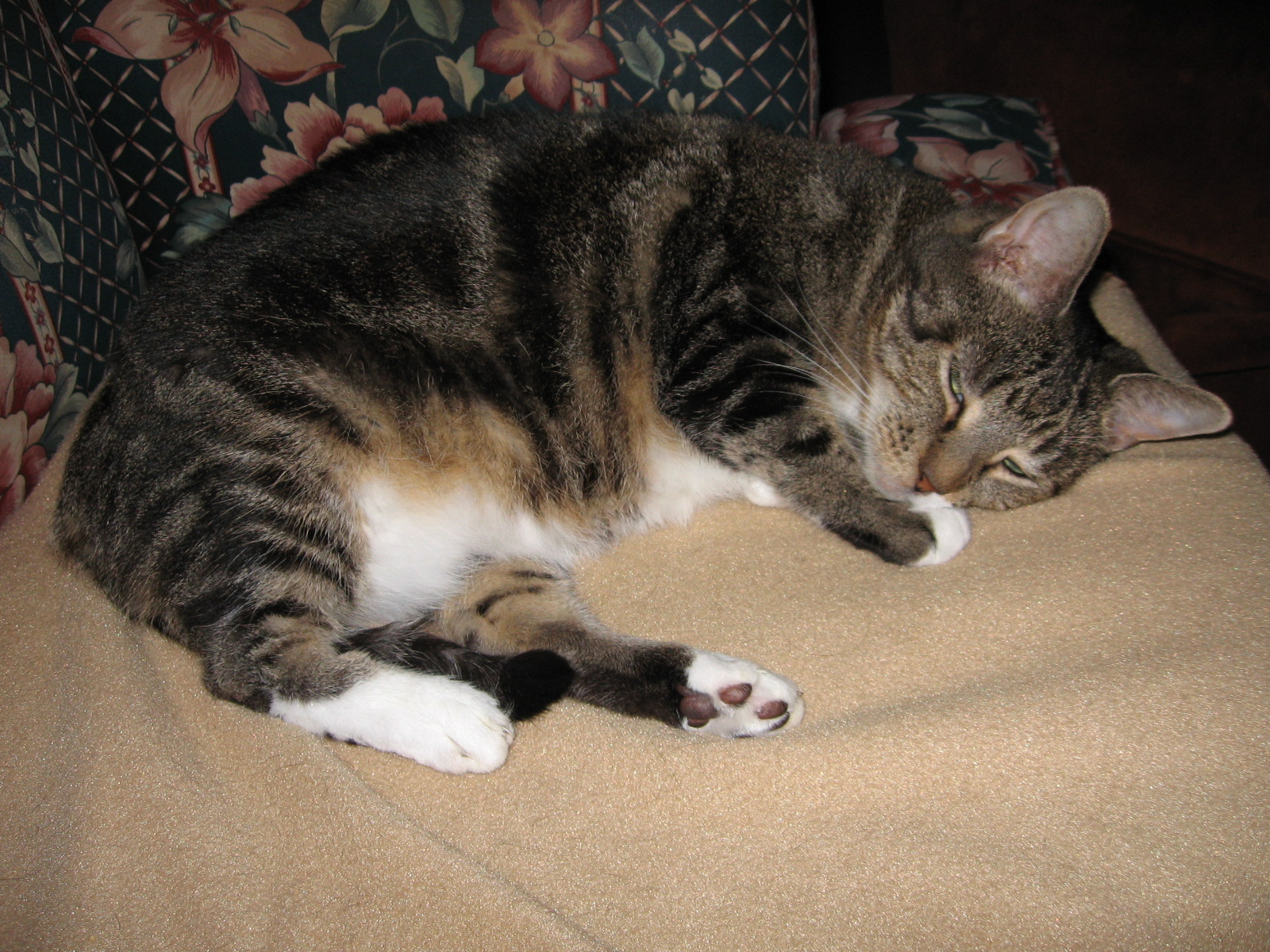 Apparently the vet did her cleaning late in the day because Pickles was still groggy from the anesthesia. It was worse than last year. The poor cat couldn’t stand up when she got home. She kept falling over to one side and turning in circles trying to get up. When she did half stand up she’d veer off to a side like a dizzy toddler coming off a merry-go-round. I was so worried I called the vet, who told me to leave her in her kennel for a couple of hours so she wouldn’t hurt herself. Around 8 p.m. I let her out to eat. Poor kitty couldn’t even eat in the kitchen. Her hind legs kept slipping on the linoleum floor. I had to put her bowl on the living room carpet.