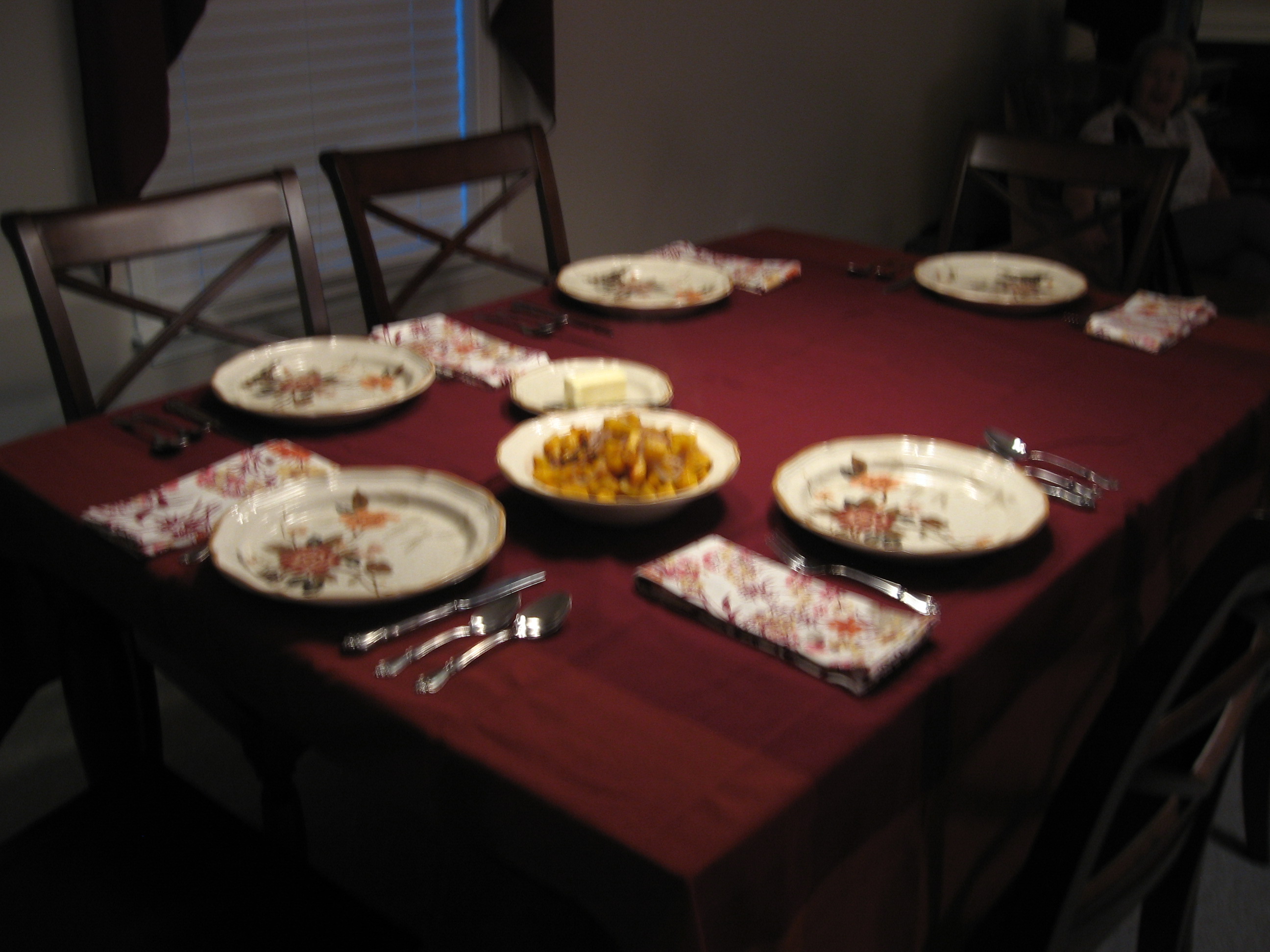 The dinner was the first time I’d had guests over to try out the new dining room table. Please note the beautiful tablecloth and cloth napkins.