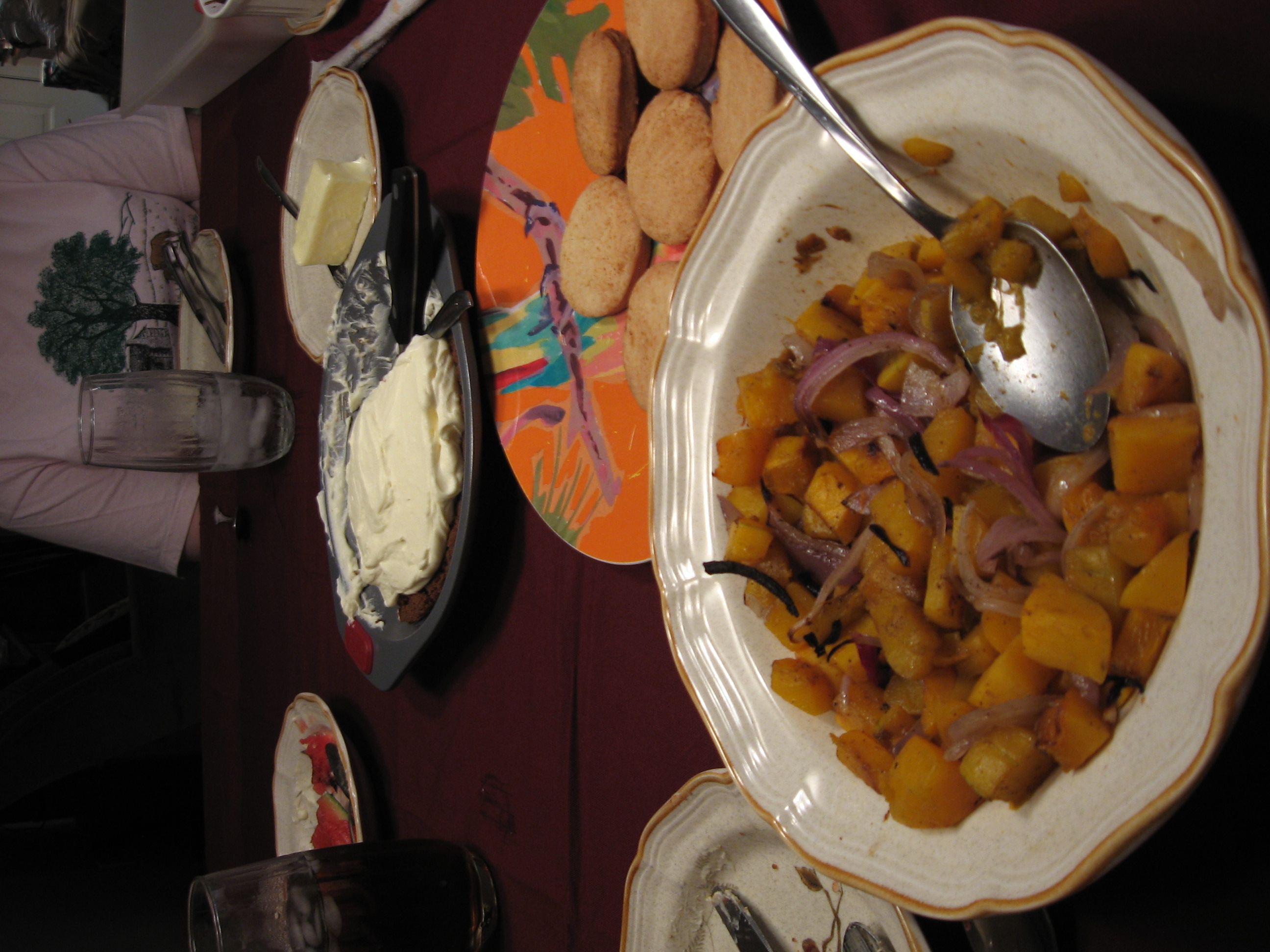 Then we added the butternut squash and ratatouille to our plates. You can see the butternut squash in the photo below. Never got a shot of the ratatouille. The only sad note was the biscuits. Turns out you can’t use double-acting baking powder that is several years old. Doesn’t work. Nope. Ah, well. Actually, they were tasty, just not fluffy. Sigh.