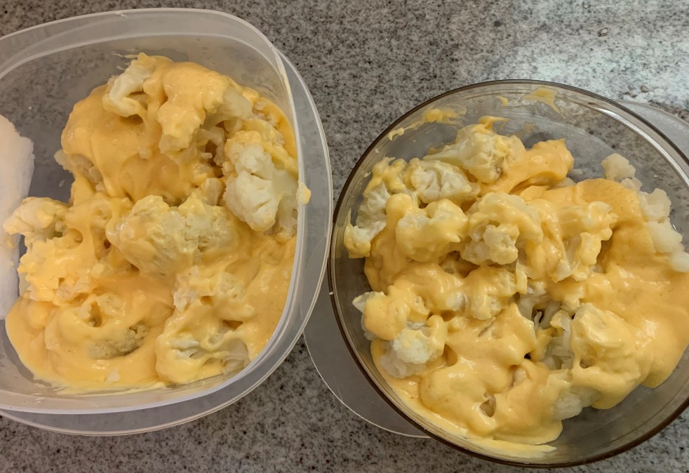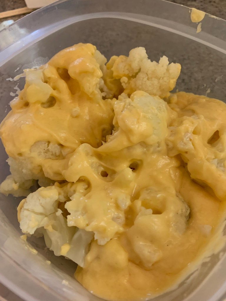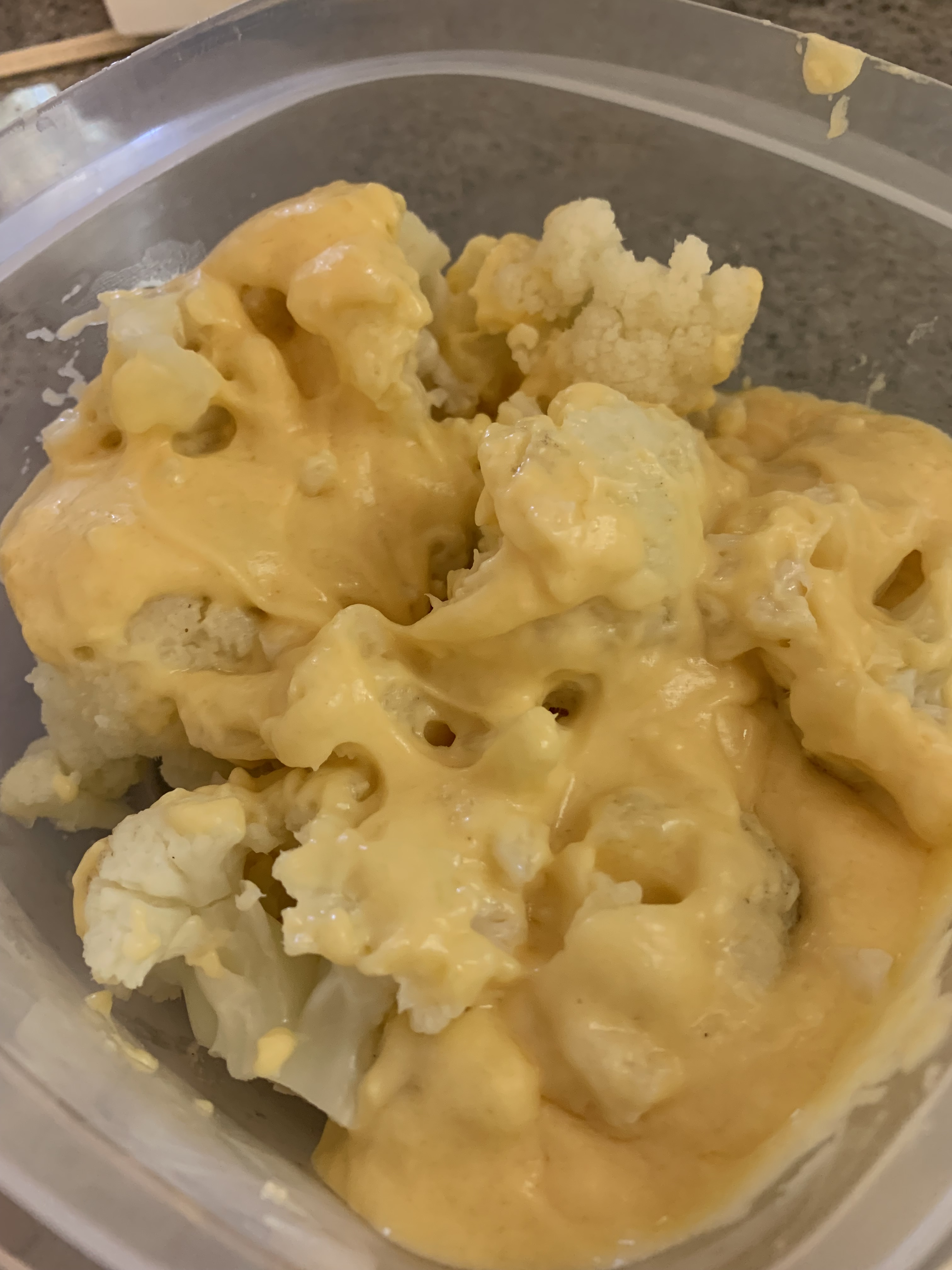 As for the cauliflower – I was a little stumped. I still had a head left over from the first week – and got another this week. The newer one will become a Cauliflower Pizza Crust. I’ve long had a super recipe for that – just need to go buy some goat cheese to make that happen. As for the older head of cauliflower – what to do? I turned to my trusty Allrecipes.com account and soon found this marvelous English dish: Cauliflower Cheese. Yes, Cauliflower Cheese. Instead of making a lovely cheese sauce to go over macaroni, you’re doing it with cauliflower. And it is delicious. Lightly steam a head of cauliflower, then whip up the homemade sauce. So beautiful, so bland, so British. If you, like me, love comfort food, but want to make yourself believe it is healthy, make a Cauliflower Cheese. I ate my lunch portion up so quickly I didn’t even get a chance to take of photo of it on my plate. So here’s what it looks like, in the Tupperware.