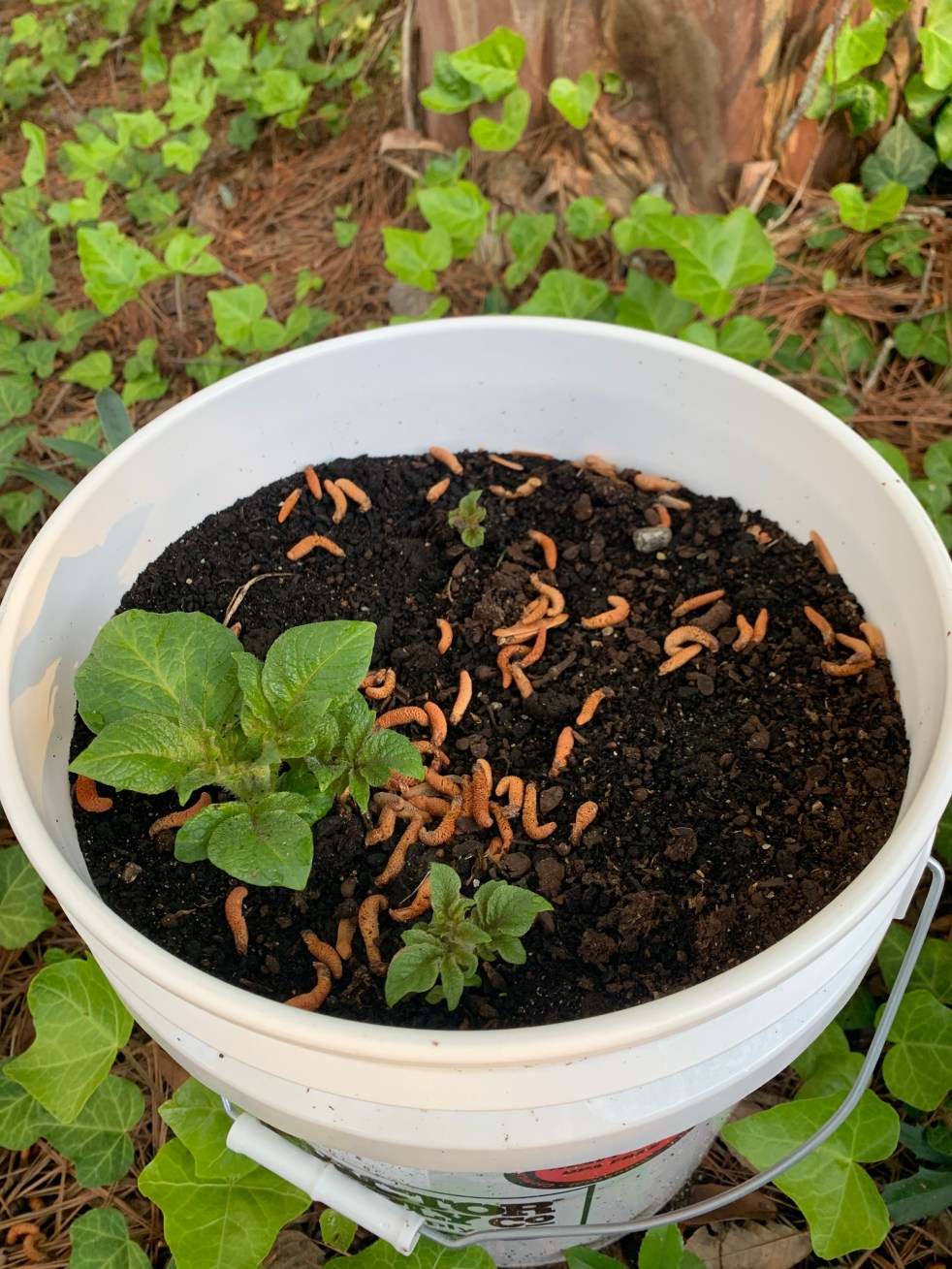 I’m so excited about the potato plants coming up I had to take pictures to share with you all. After many more YouTube videos I quickly realized I should have poked more drainage holes in the bottom of the five-gallon buckets (another lesson learned) but at least I’ve put them up off the ground slightly, to aid in drainage. The plants look terrific.