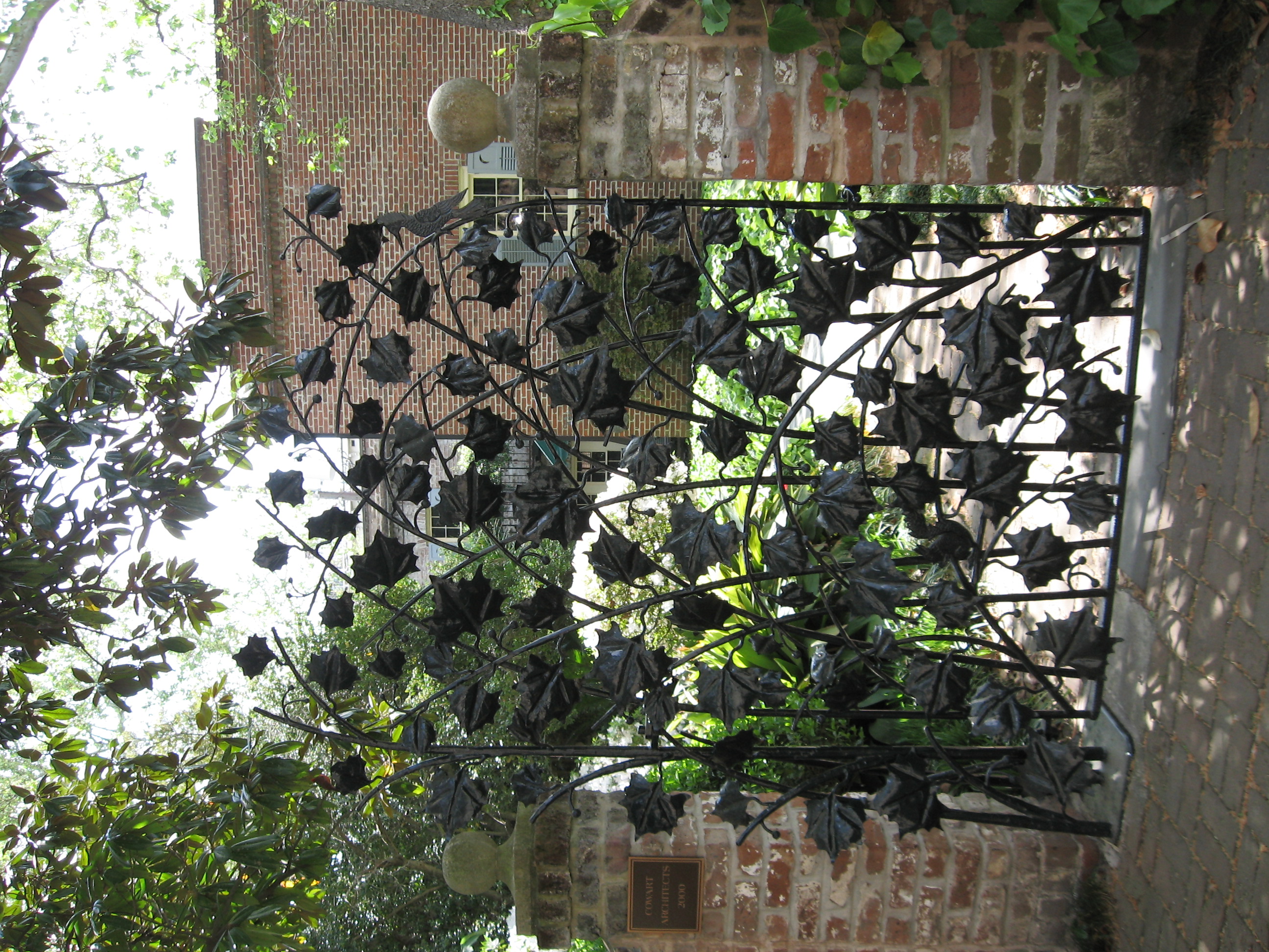 Look for the bird perched among the iron leaves of this gate.