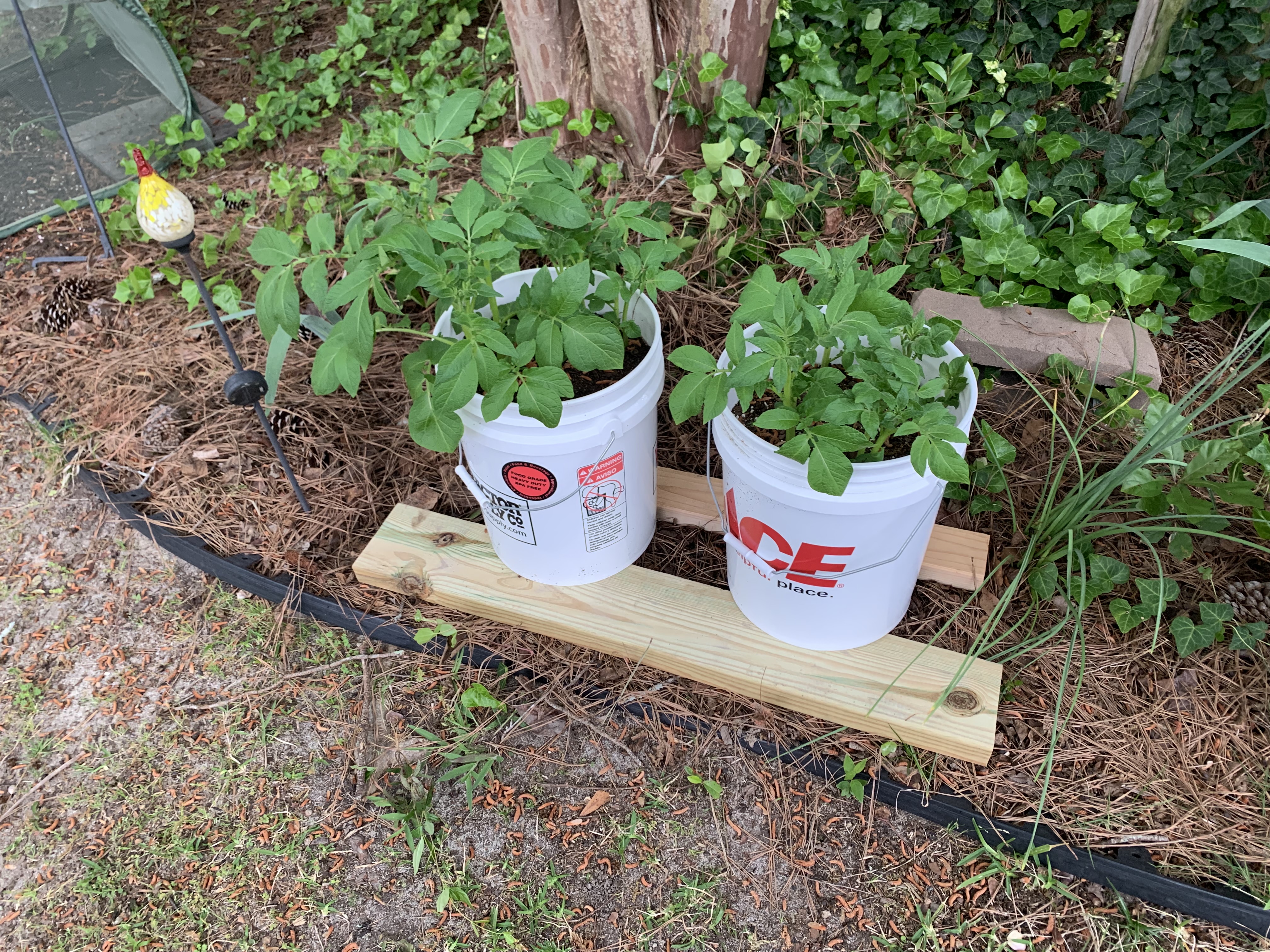 I’m so excited about the potato plants coming up I had to take pictures to share with you all. After many more YouTube videos I quickly realized I should have poked more drainage holes in the bottom of the five-gallon buckets (another lesson learned) but at least I’ve put them up off the ground slightly, to aid in drainage. The plants look terrific.