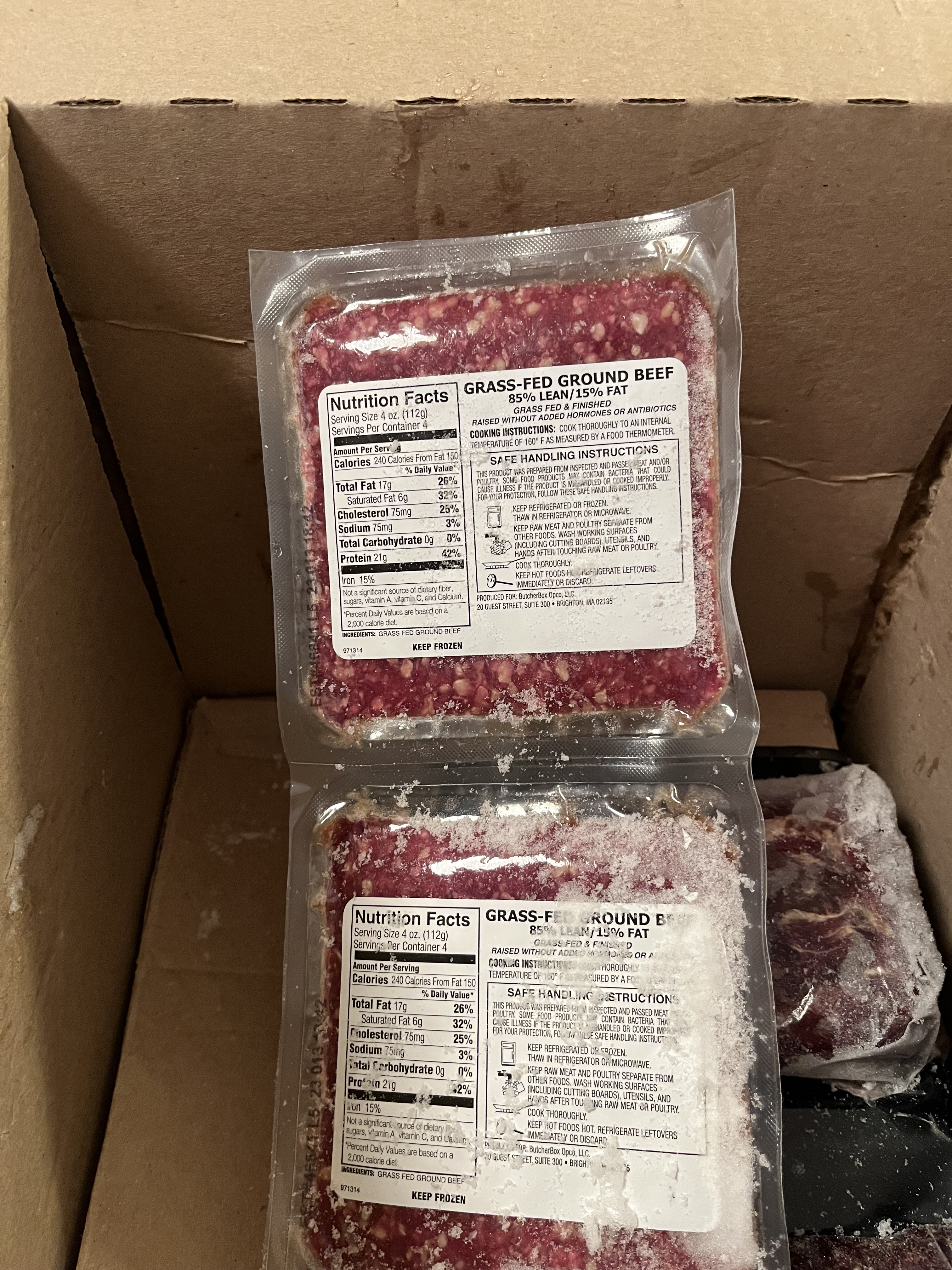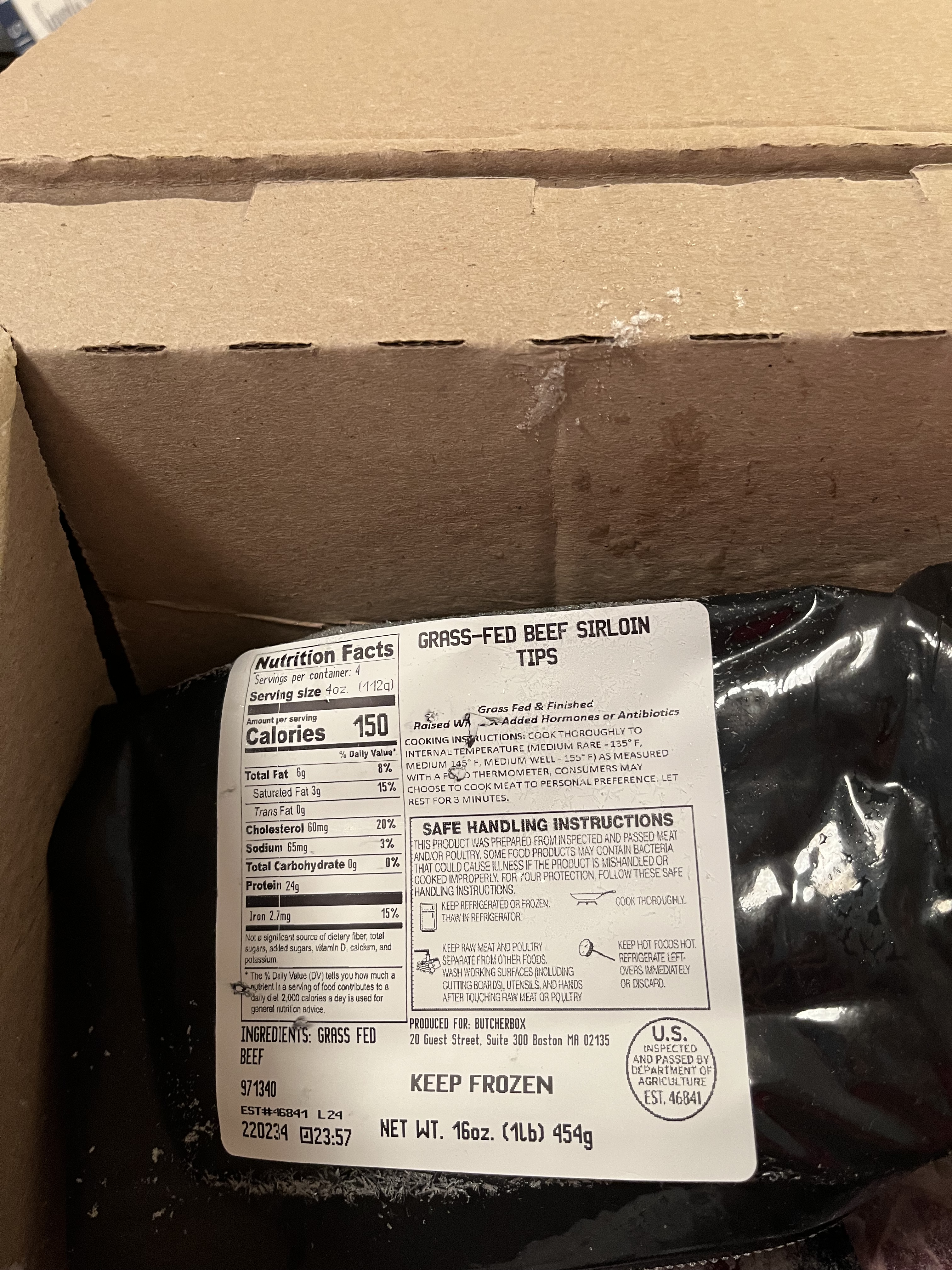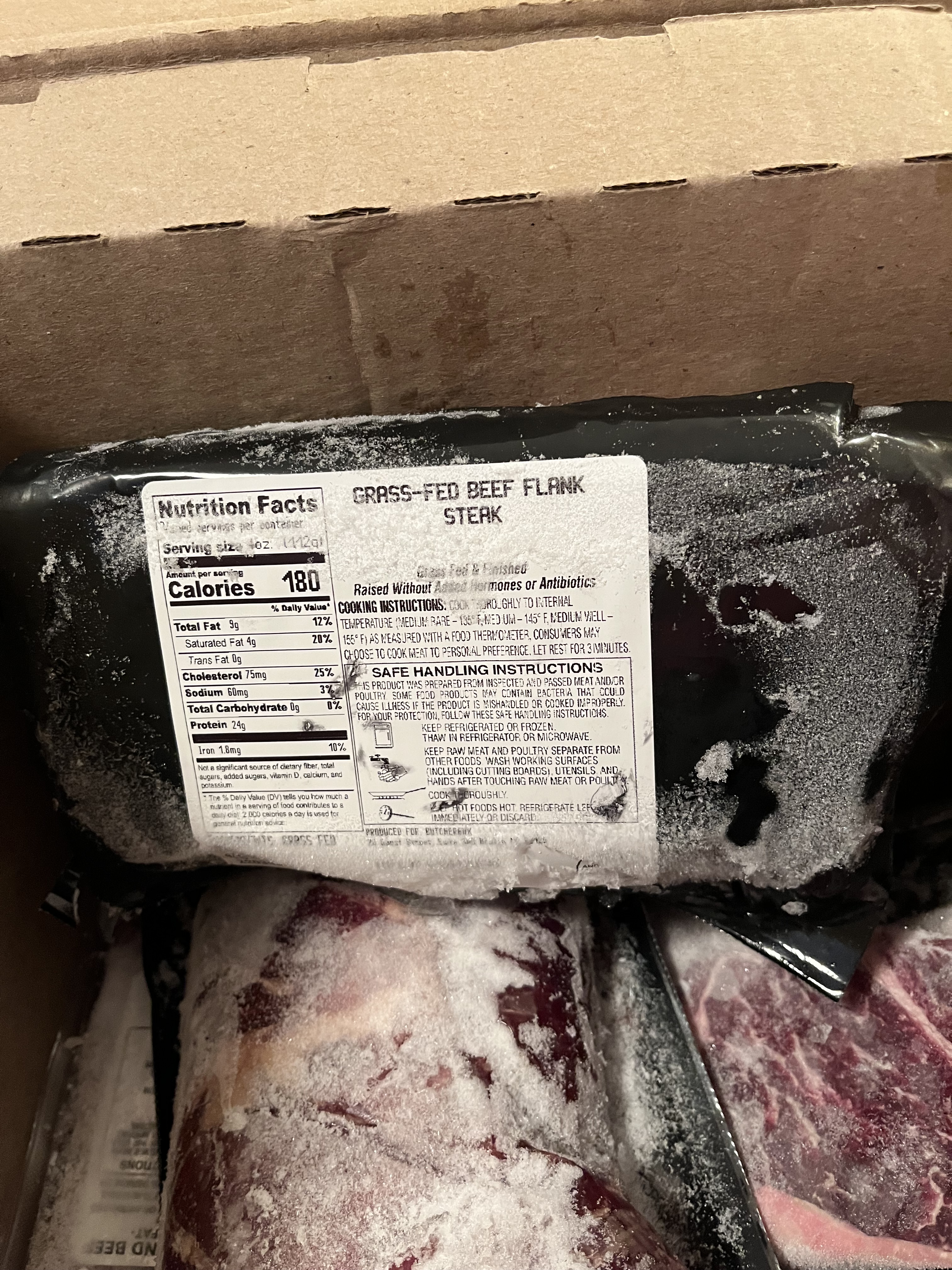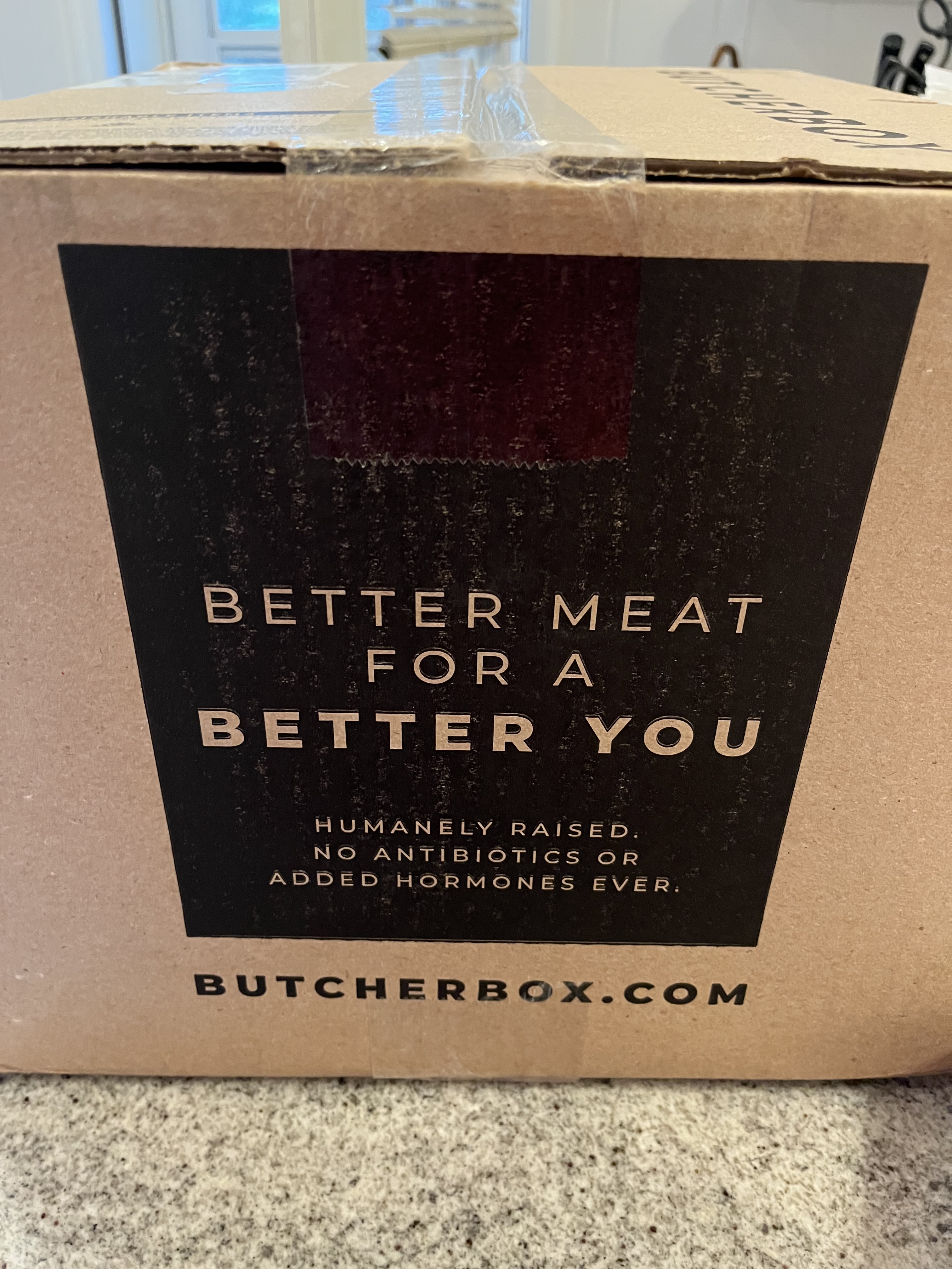This afternoon I arrived home to find that this month’s Butcher Box meat delivery box was on the front porch, ready for me to load to my freezer. I quickly whisked it indoors and started taking the pictures I’m sharing with you during the unboxing. I used to worry about whether the meat will stay frozen. It can sit outside on my porch several hours between delivery and my arrival home. I needn’t have worried; these guys know what they’re doing with the amount of dry ice they put in the boxes. Even though the dry ice had evaporated, all my meat was still frozen and looked good.